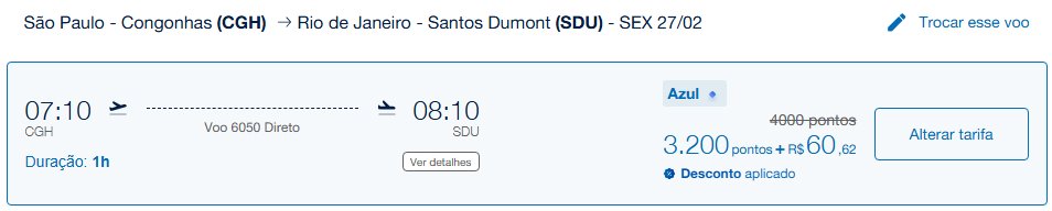 Custo: 3.200 pontos para clientes Azul Diamante ou 4.000 para os demais clientes