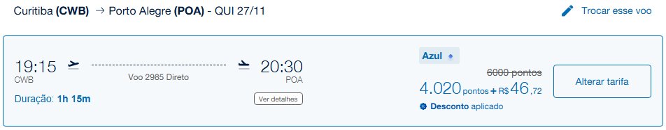 Custo: 4.020 pontos para clientes Azul Diamante ou 6.000 para os demais clientes
