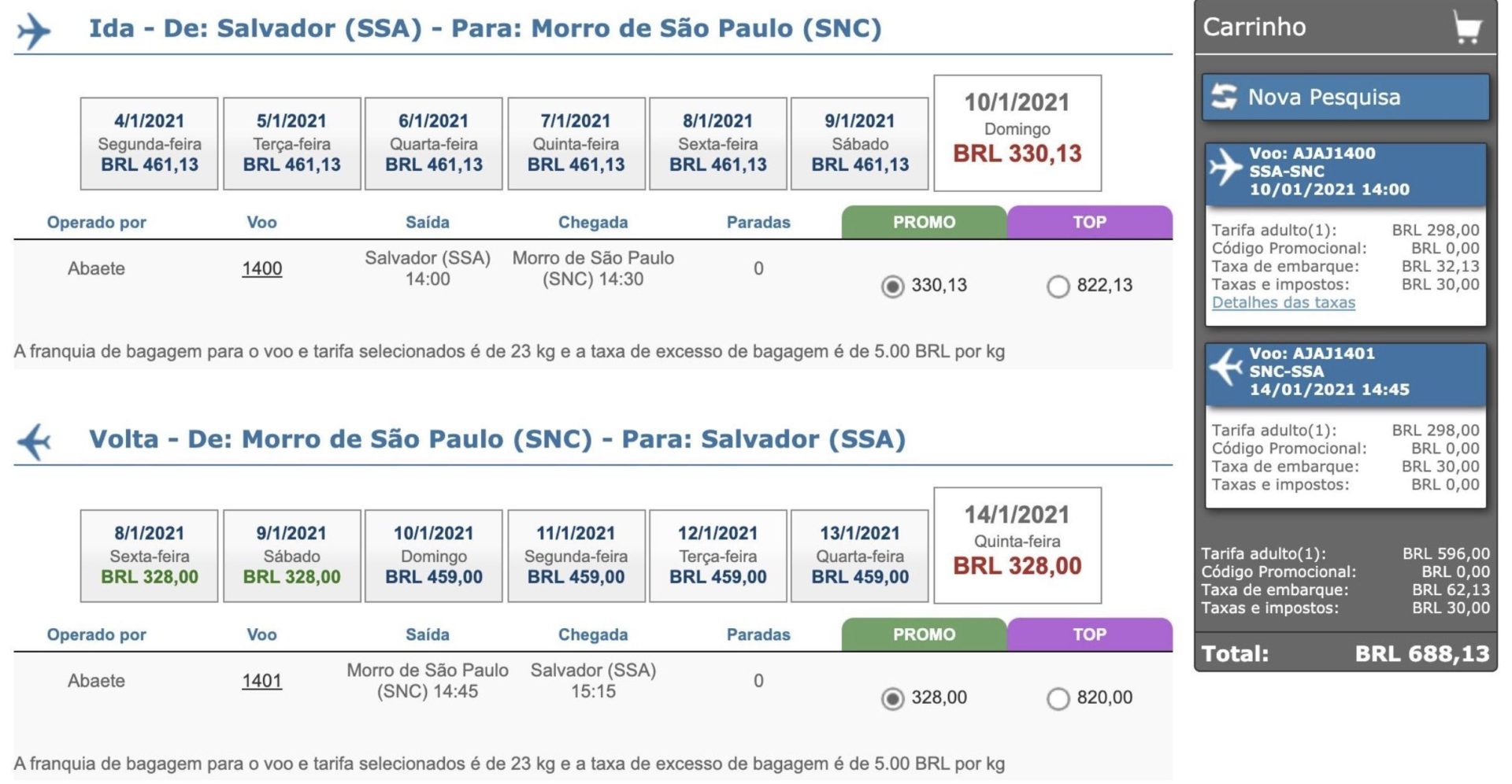 Fizemos uma breve pesquisa no site da Abaeté sobre disponibilidade e valores, assim concluimos que os voos não são tão baratos, mas de uma extrema comodidade devido pelo horário muito conveniente, e o rápido tempo de voo. O que antes poderia demorar mais de 2 horas em uma navegação um tanto quanto turbulenta, agora se pode chegar em 30 minutos. Abaixo segue uma pesquisa para voar em Janeiro (Alta Temporada):