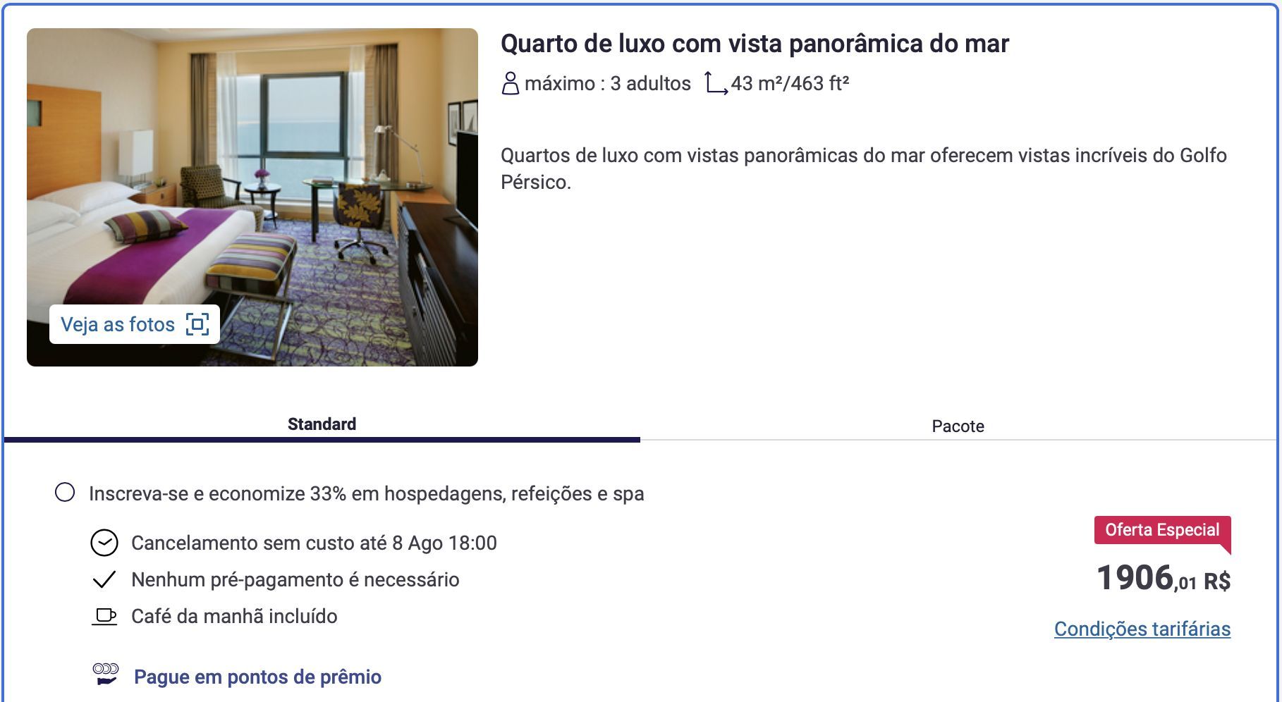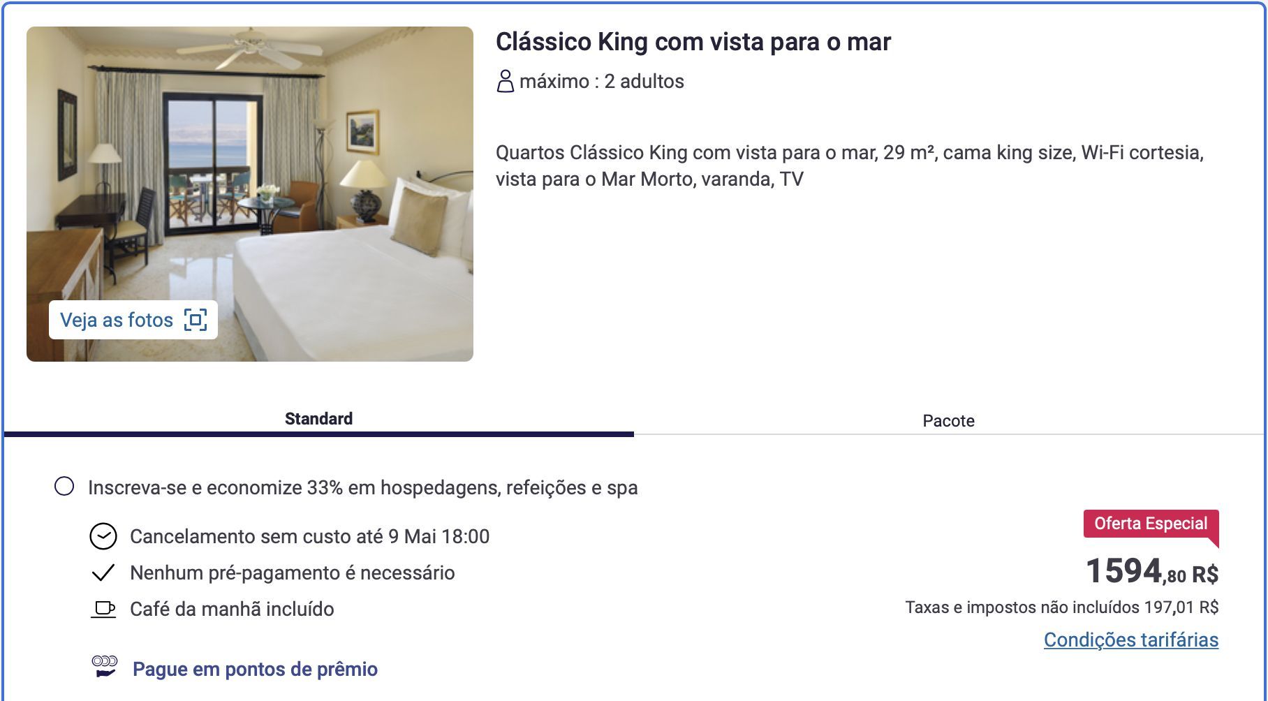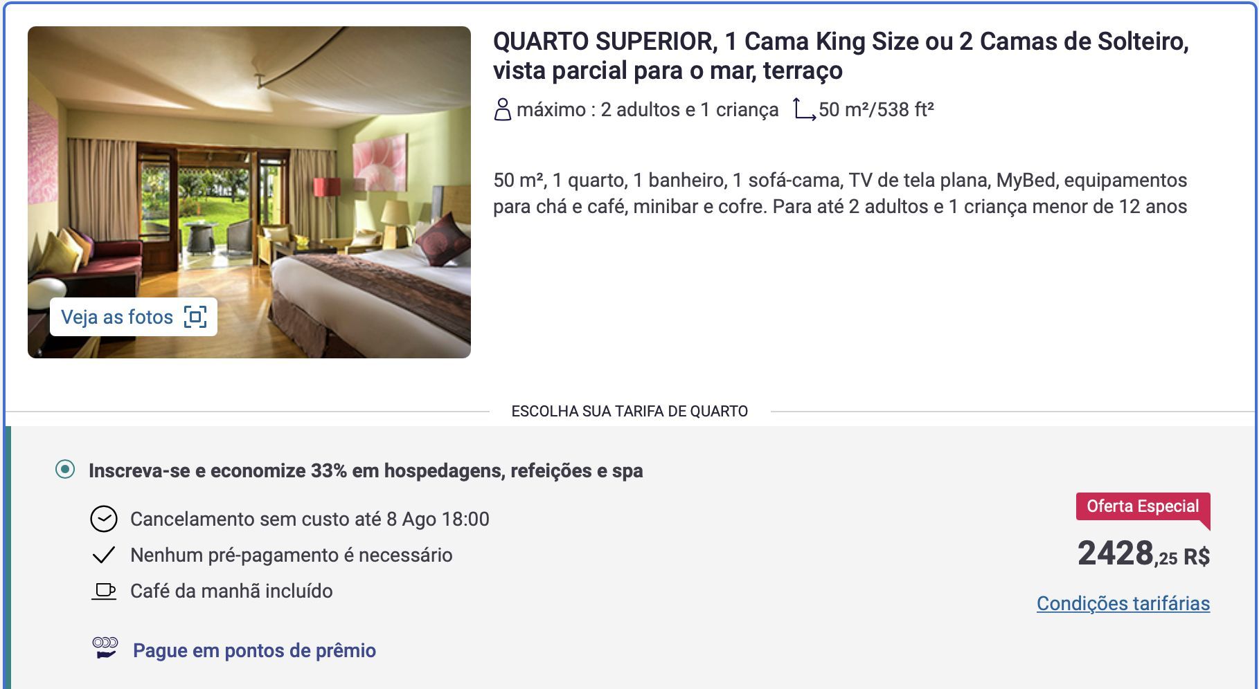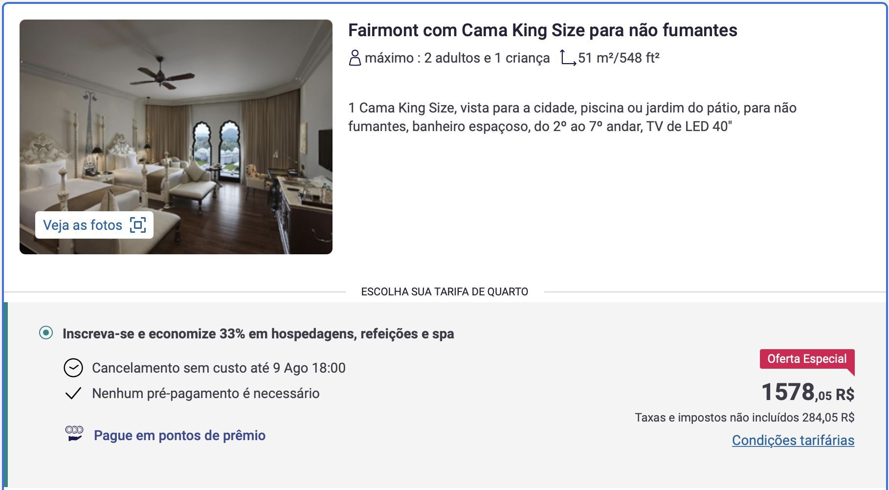 Durante a reserva você deve encontrar a tarifa “Inscreva-se e economize 33% em hospedagens, refeições e spa” (como nos exemplos abaixo).