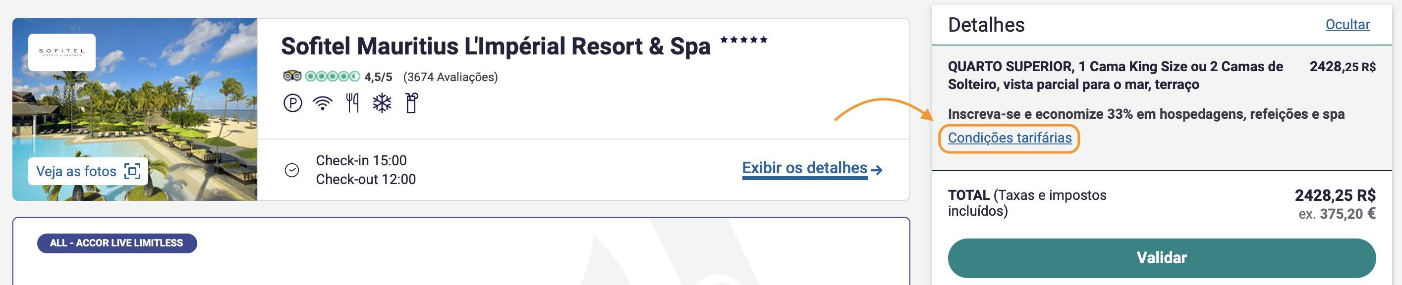 Para confirmar que você está reservando a tarifa correta você pode clicar em “Condições tarifárias” e obter mais detalhes. O sistema exibirá a seguinte mensagem: