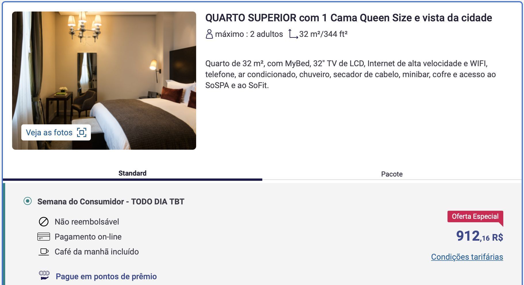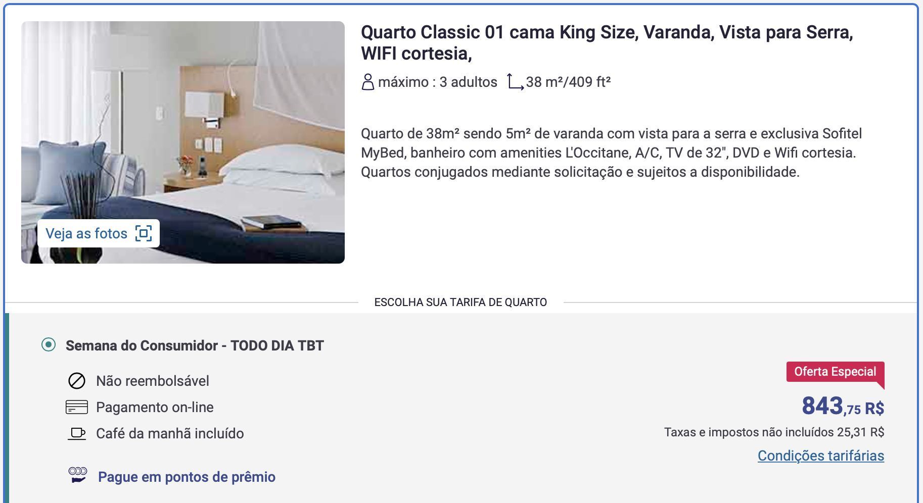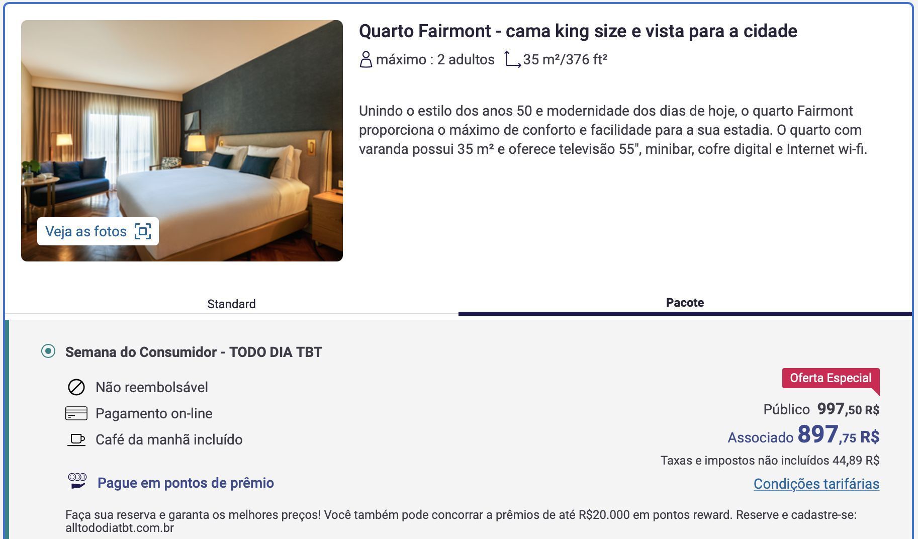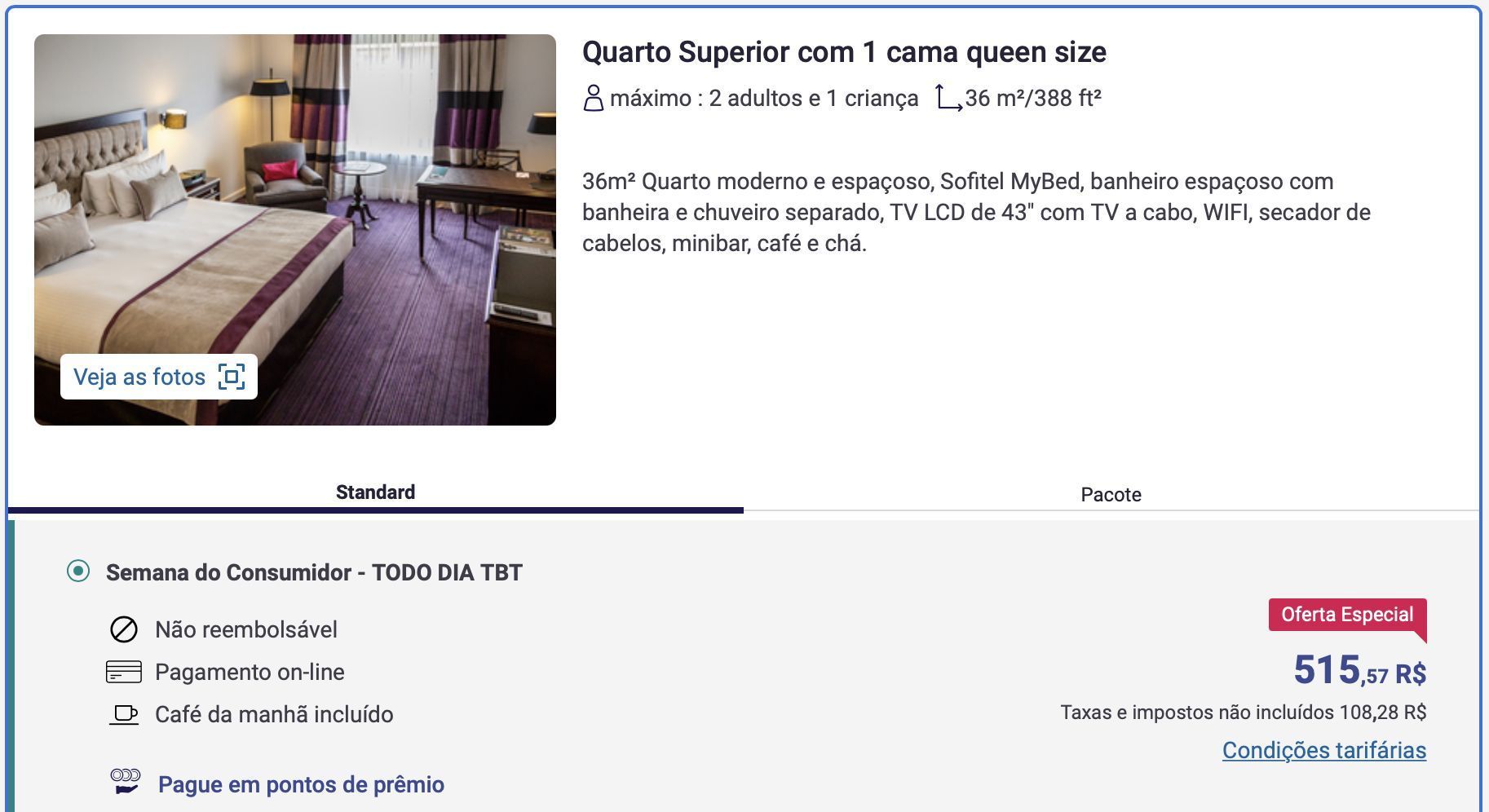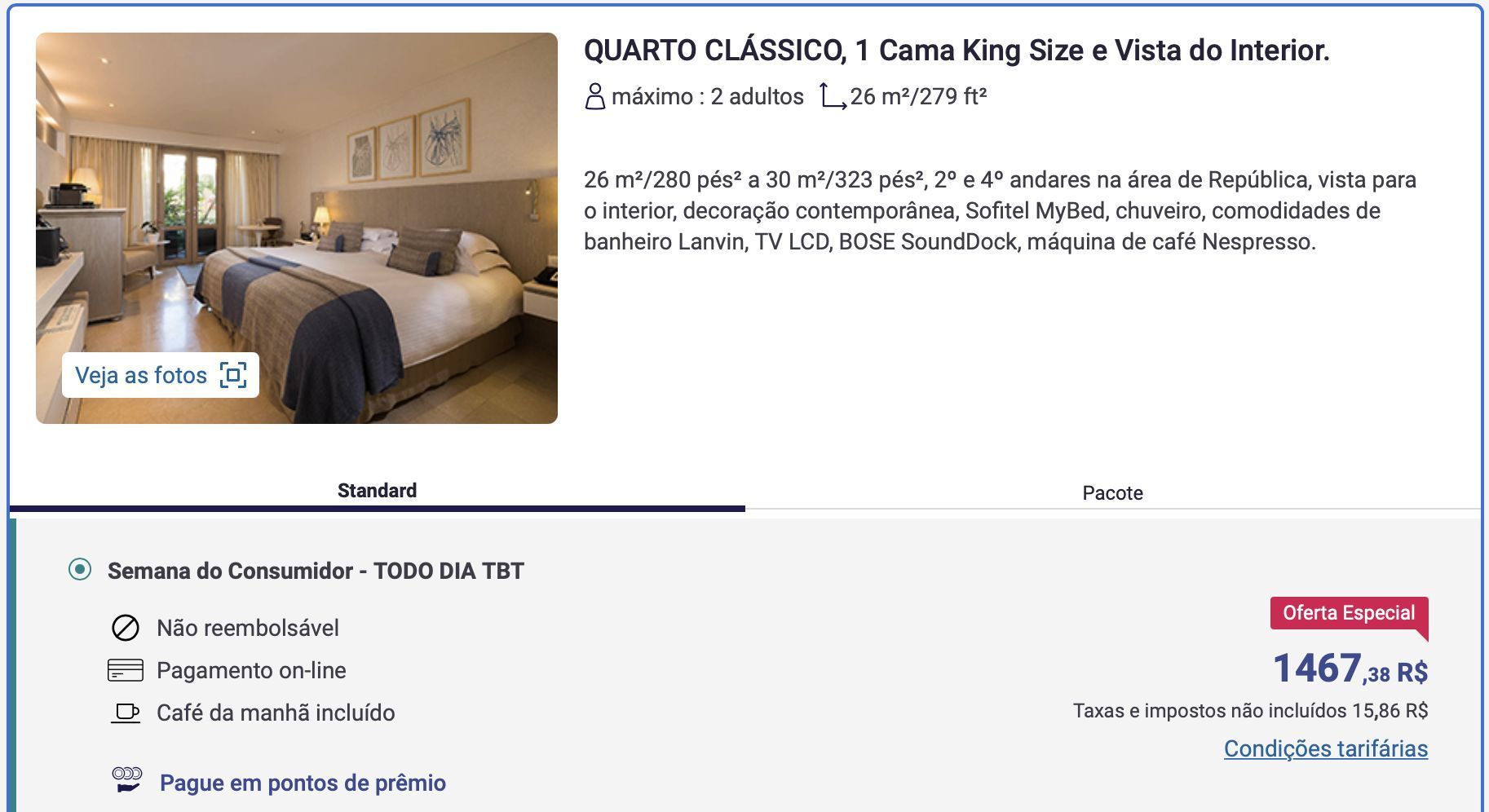 O melhor da “Semana do Consumidor – TODO DIA TBT” da Accor é a ampla disponibilidade da tarifa que oferece até 35% desconto + café da manhã. Durante as nossas buscas a encontramos com facilidade em todos as propriedades da rede na América do Sul – incluindo, em hotéis badalados como o Fairmont Rio de Janeiro Copacabana, o Santa Teresa Hotel RJ MGallery e o Sofitel Guarujá Jequitimar.