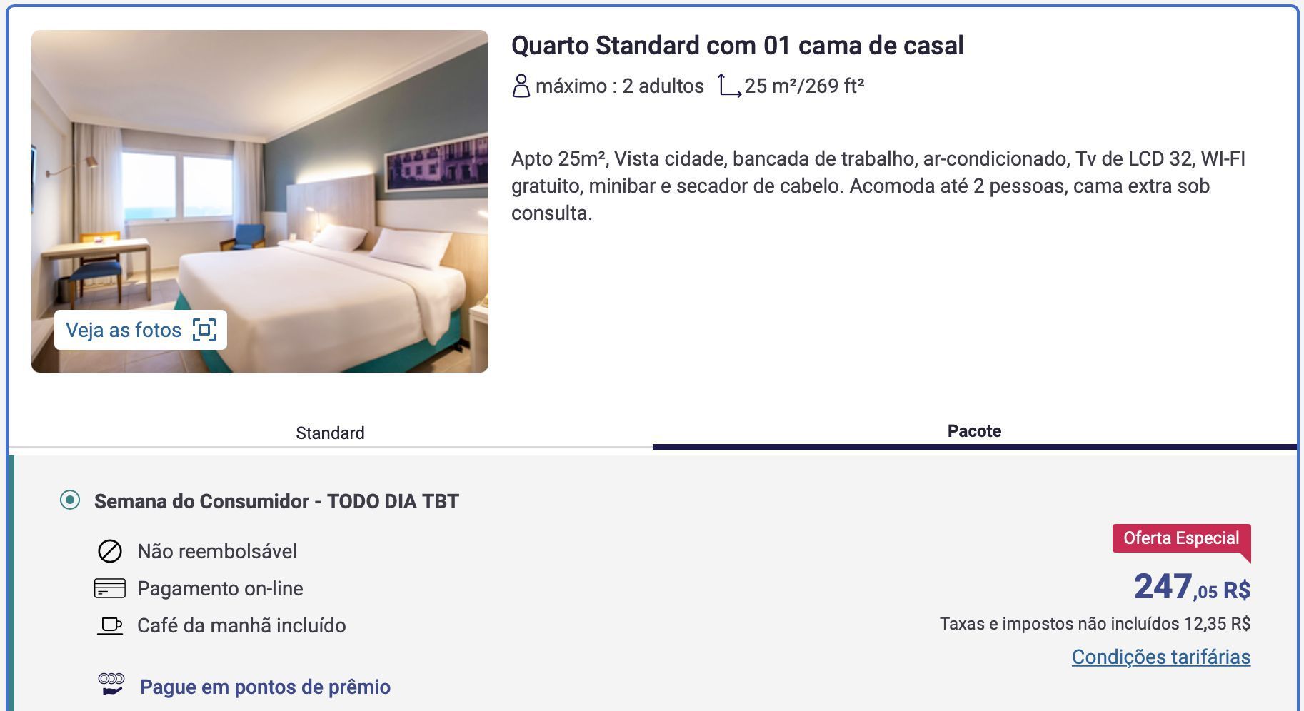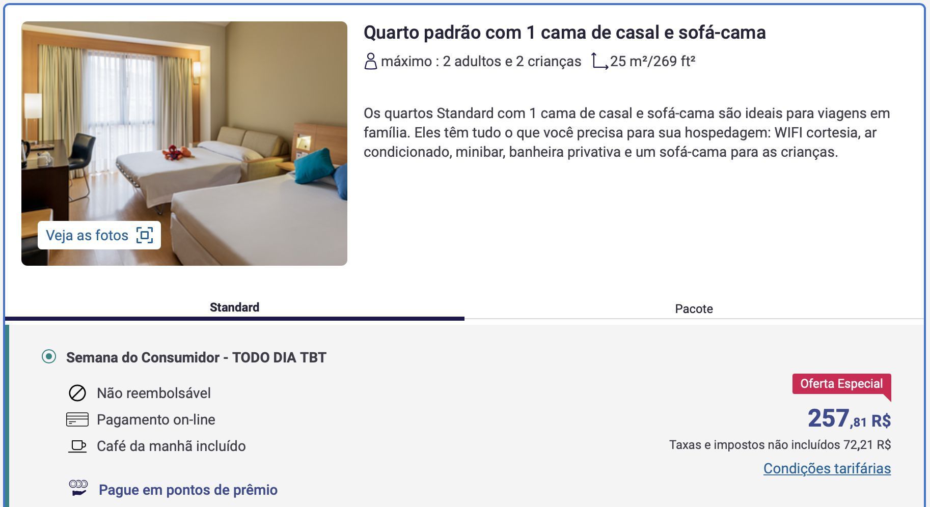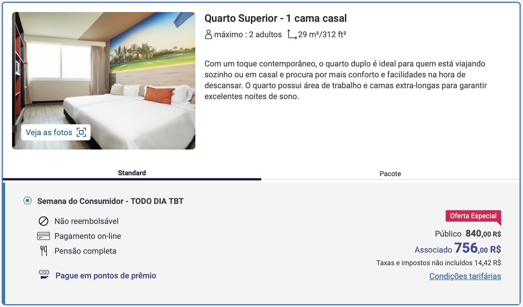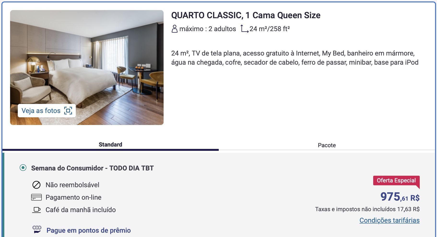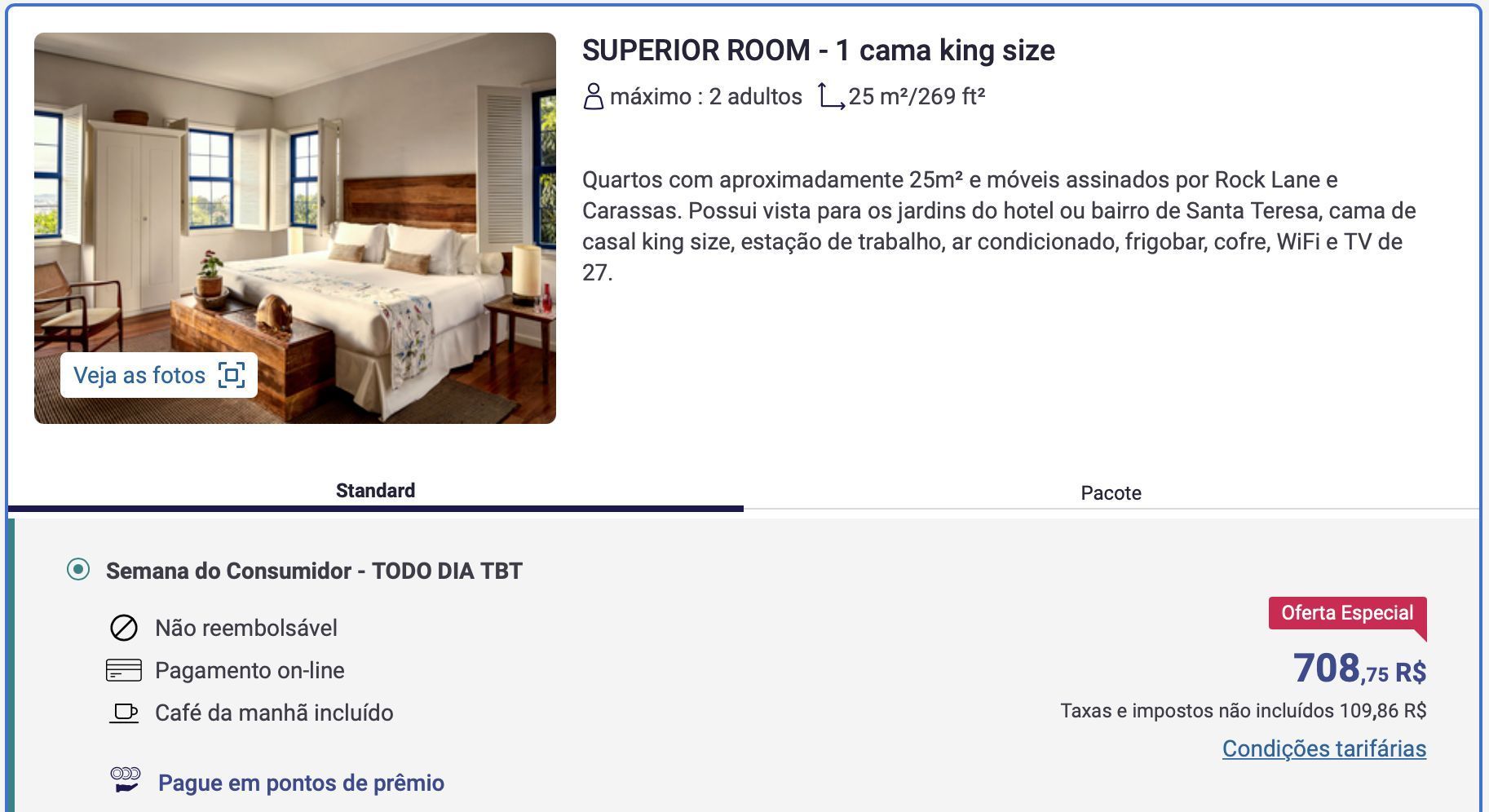 O melhor da “Semana do Consumidor – TODO DIA TBT” da Accor é a ampla disponibilidade da tarifa que oferece até 35% desconto + café da manhã. Durante as nossas buscas a encontramos com facilidade em todos as propriedades da rede na América do Sul – incluindo, em hotéis badalados como o Fairmont Rio de Janeiro Copacabana, o Santa Teresa Hotel RJ MGallery e o Sofitel Guarujá Jequitimar.
