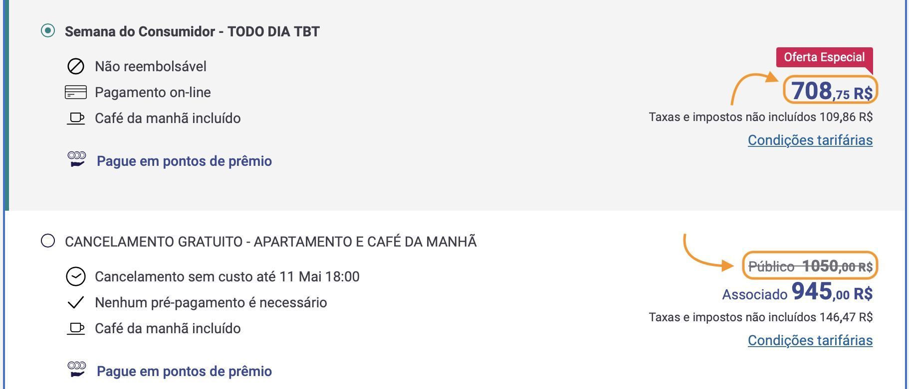 O desconto varia entre 30% e 35% a depender da marca do hotel. O café da manhã está incluso em todas as diárias.
