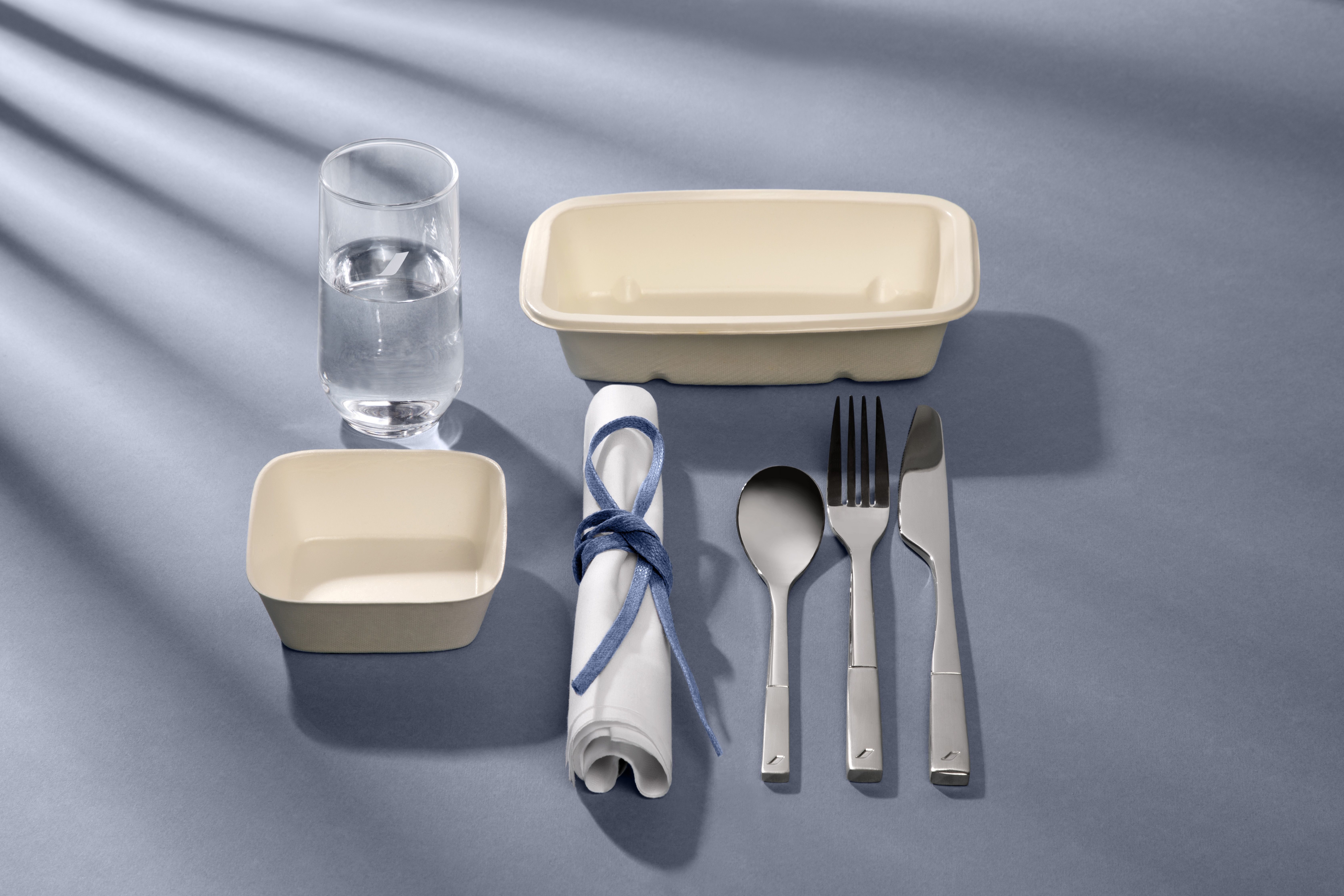 Para complementar os azuis entra o vermelho, que estampa os encostos de cabeça, almofadas, amenity kits e bandejas de refeição.