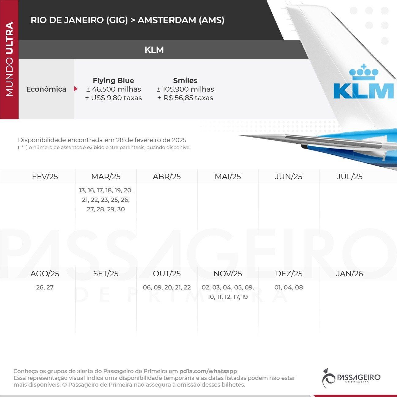 Alerta direto dos Grupos do PP no WhatsApp! 🚨 Encontramos disponibilidade de bilhetes de ida e volta entre Rio de Janeiro (GIG) e Amsterdam (AMS). Os voos são operados pela KLM e a emissão pode ser feita a partir de 46.500 milhas Flying Blue ou 105.900 milhas Smiles por trecho + taxas. Confira!