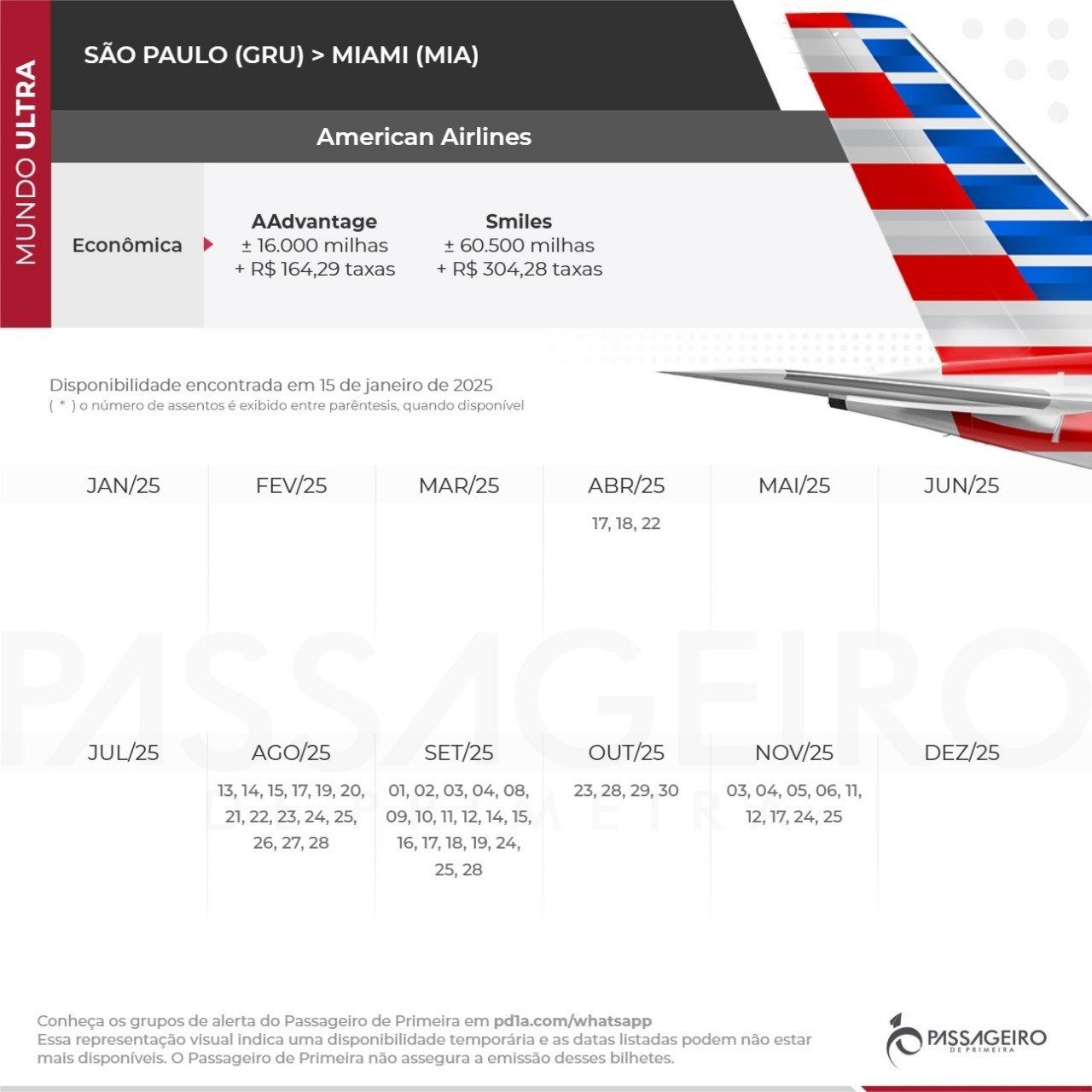 Alerta direto dos Grupos do PP no WhatsApp! 🚨 Encontramos disponibilidade de bilhetes de ida e volta entre São Paulo (GRU) e Miami (MIA). Os voos são operados pela American Airlines e a emissão pode ser feita a partir de 16.000 milhas AAdvantage ou 60.500 milhas Smiles por trecho + taxas. Confira!