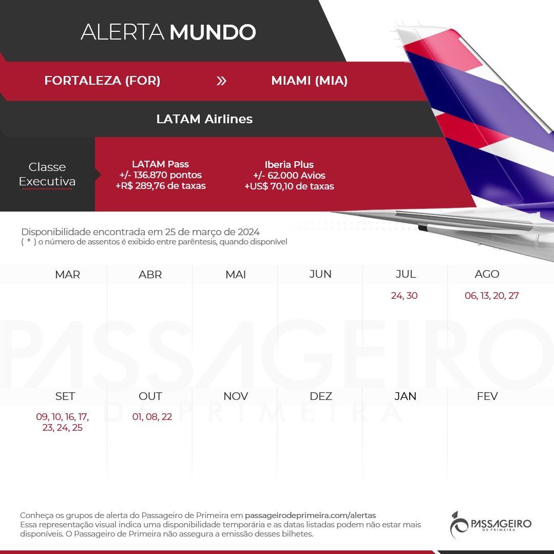 Alerta direto dos Grupos do PP no WhatsApp! 🚨 Encontramos disponibilidade de bilhetes de ida e volta em Classe Executiva entre Fortaleza (FOR) e Miami (MIA). Os voos são operados pela LATAM Airlines e a emissão pode ser feita através do LATAM Pass ou Iberia Plus.
