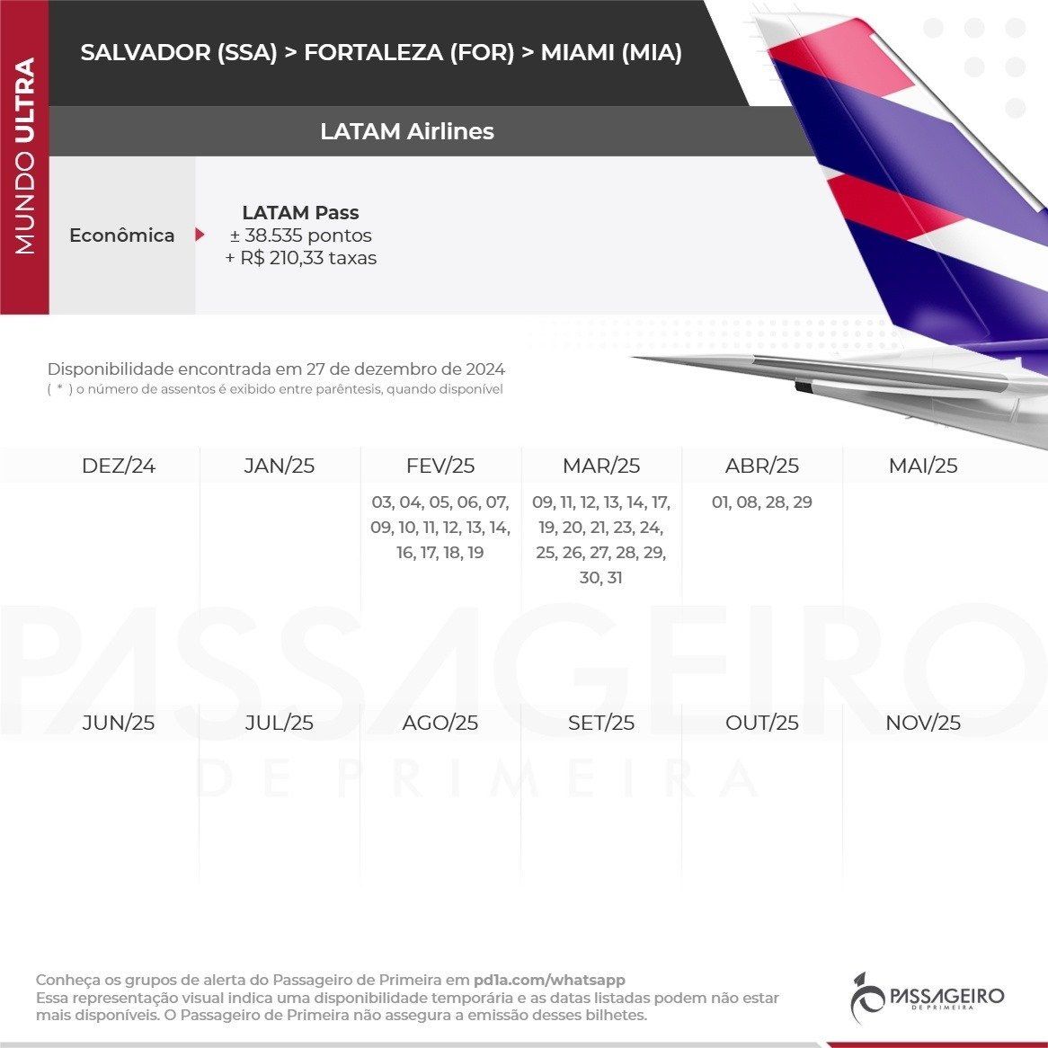 Alerta direto dos Grupos do PP no WhatsApp! 🚨 Encontramos disponibilidade de bilhetes de ida e volta entre Salvador (SSA) e Miami (MIA). Os voos são operados pela LATAM Airlines e a emissão pode ser feita a partir de 38.535 pontos LATAM Pass trecho + taxas. Confira!