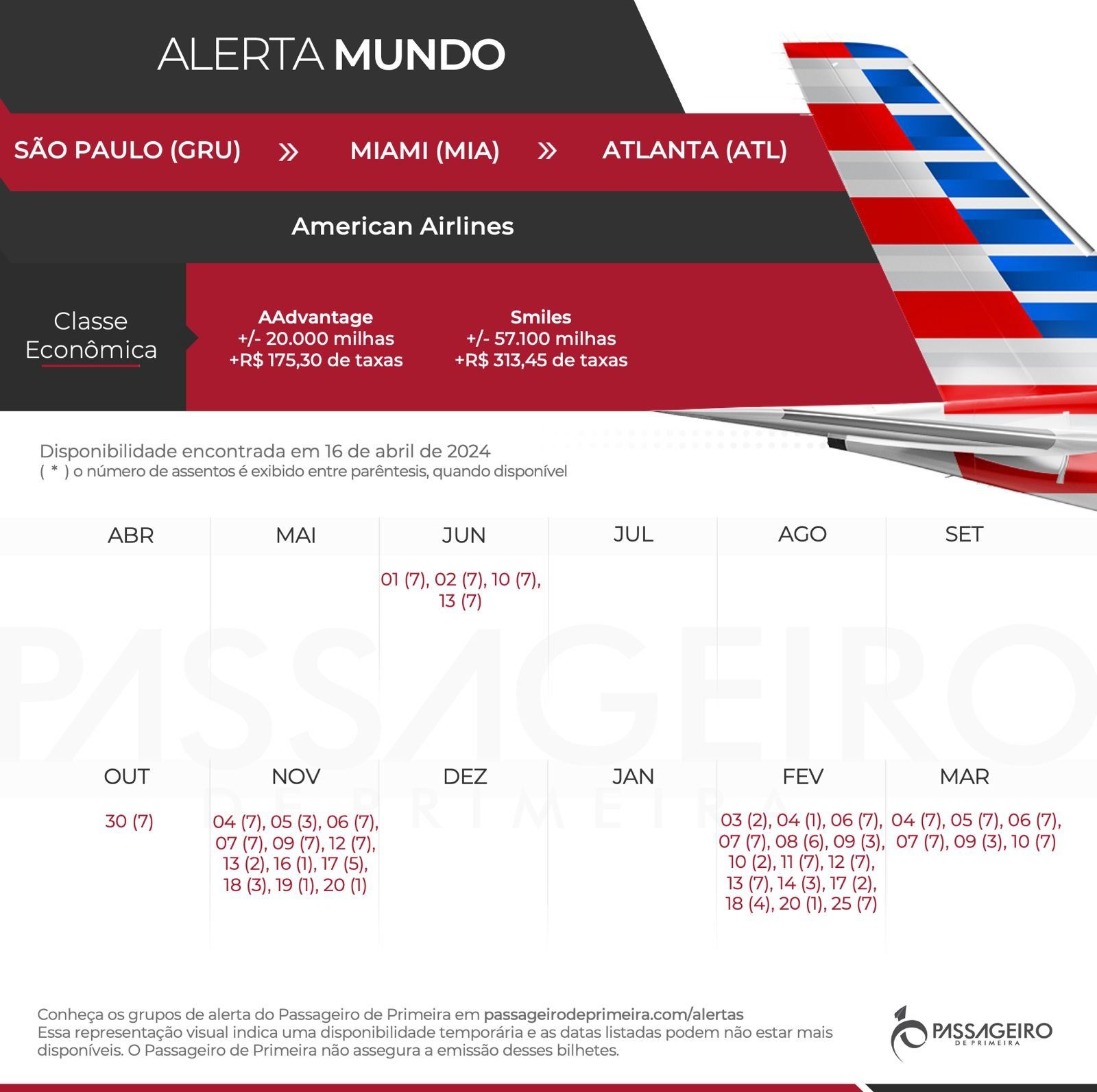 Alerta direto dos Grupos do PP no WhatsApp! 🚨 Encontramos disponibilidade de bilhetes de ida e volta em Classe Econômica entre São Paulo (GRU) e Atlanta (ATL). Os voos são operados pela American Airlines e a emissão pode ser feita a partir de 20.000 milhas AAdvantage ou 57.100 milhas Smiles.