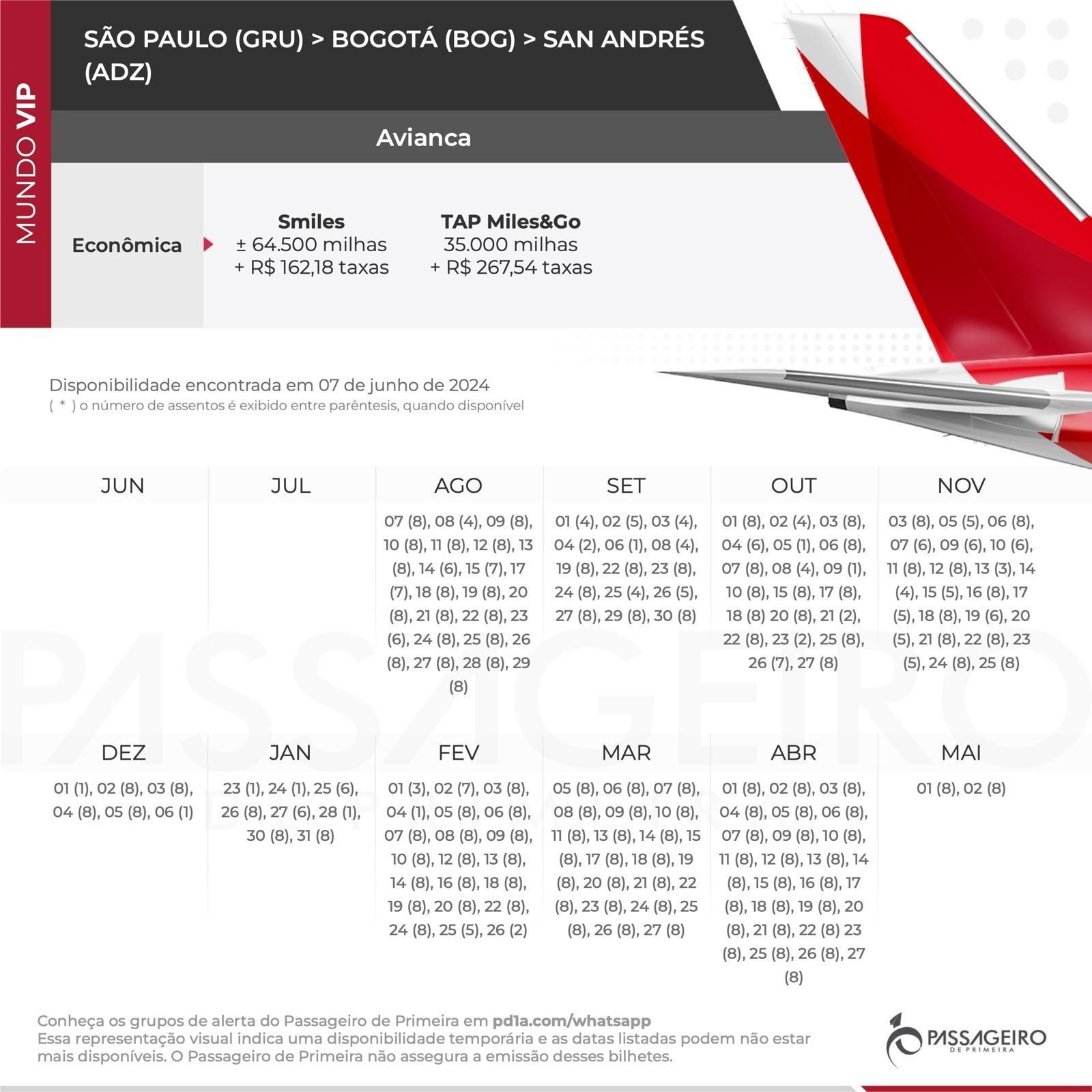 Alerta direto dos Grupos do PP no WhatsApp! 🚨 Encontramos disponibilidade de bilhetes em Classe Econômica entre São Paulo (GRU) e San Andrés (ADZ), com conexão em Bogotá. Os voos são operados pela Avianca e a emissão pode ser feita a partir de 64.500 milhas Smiles + taxas o trecho.