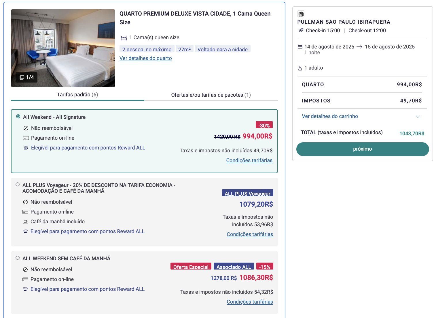 Realizamos uma simulação e conseguimos encontrar a tarifa promocional “ALL Weekend”. Veja, por exemplo, uma simulação de hospedagem em São Paulo entre 14 e 15 de agosto: