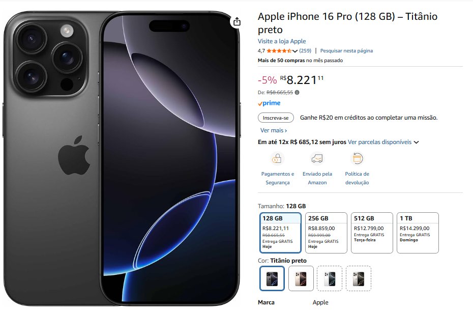 - iPhone 16 Pro 128GB | 5% de desconto – total R$ 8.221,11 – compre aqui