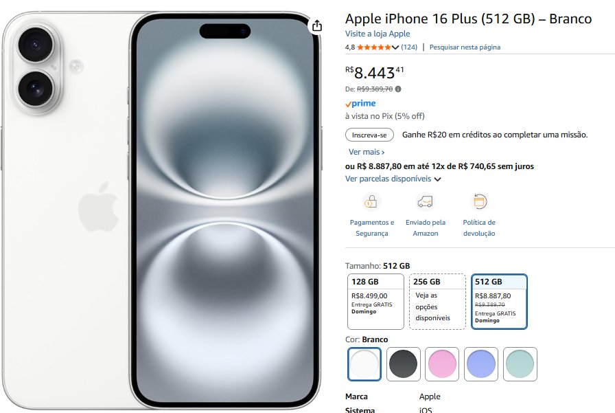 - iPhone 16 Plus 512GB | 5% de desconto – total R$ 8.443,41 – compre aqui