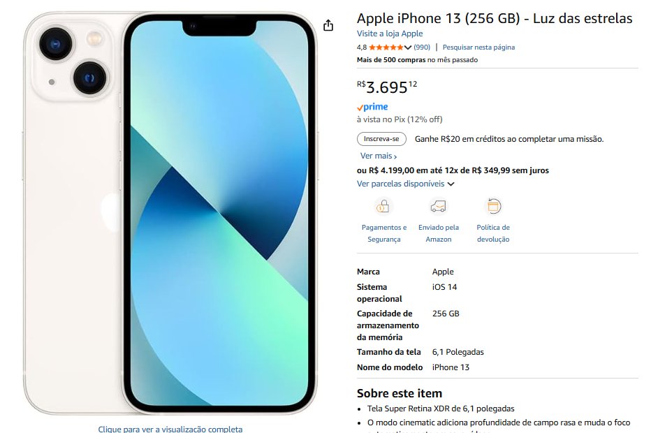 - iPhone 13 256GB| 12% de desconto – total R$ 3.695,12 – compre aqui