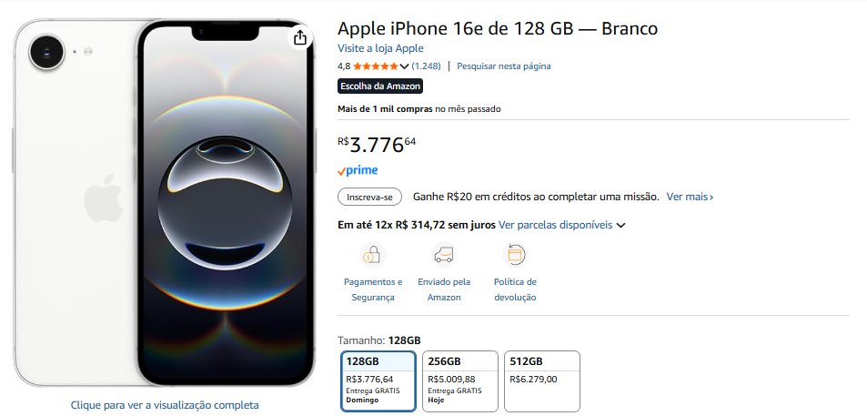 - iPhone 16e 128GB – total R$ 3.776,64 – compre aqui
