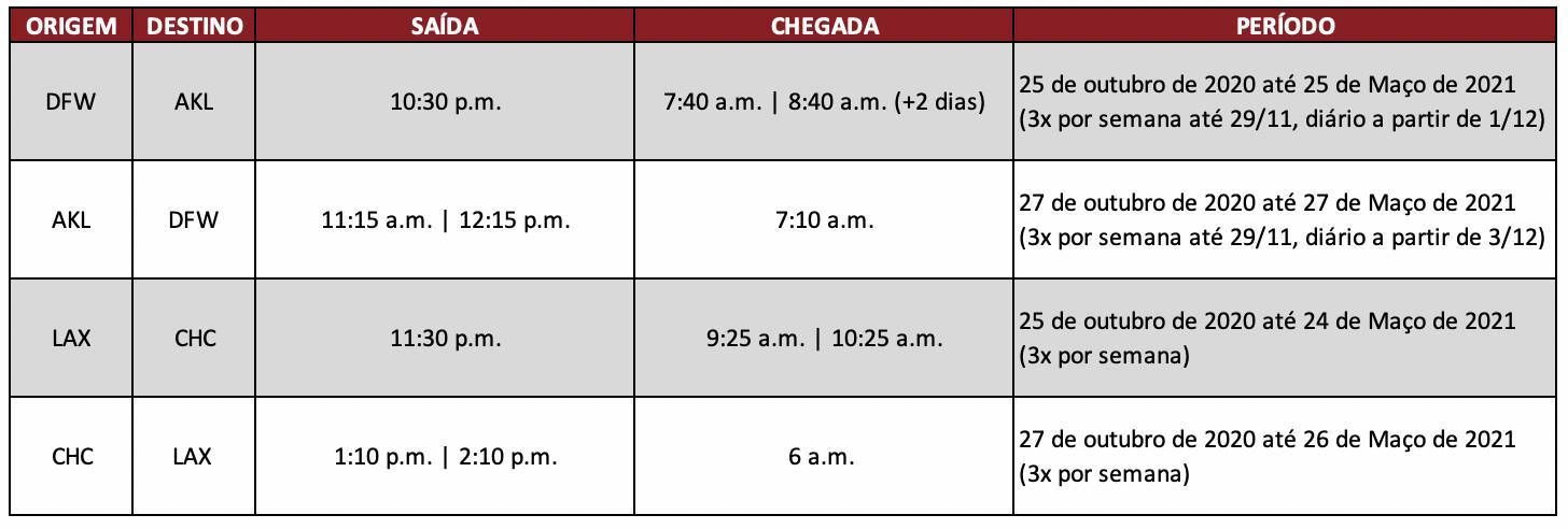 Os voos de Los Angles para Auckland, que se iniciam a partir de outubro de 2020, estarão disponíveis para compra a partir de 9 de novembro. Já os novos voos entre Los Angeles e Christchurch e entre Dallas e Auckland estarão disponíveis para compra a partir de 30 de novembro.