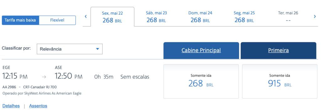 Conforme noticiado pelo One Mile At a Time, a American Eagle passou a operar um voo de apenas 47km de distância entre Vail (EGE) e Aspen (ASE), no estado do Colorado. O voo está programado para operar até 1º de junho, embora, possivelmente, tenha o potencial de ser estendido por mais tempo.