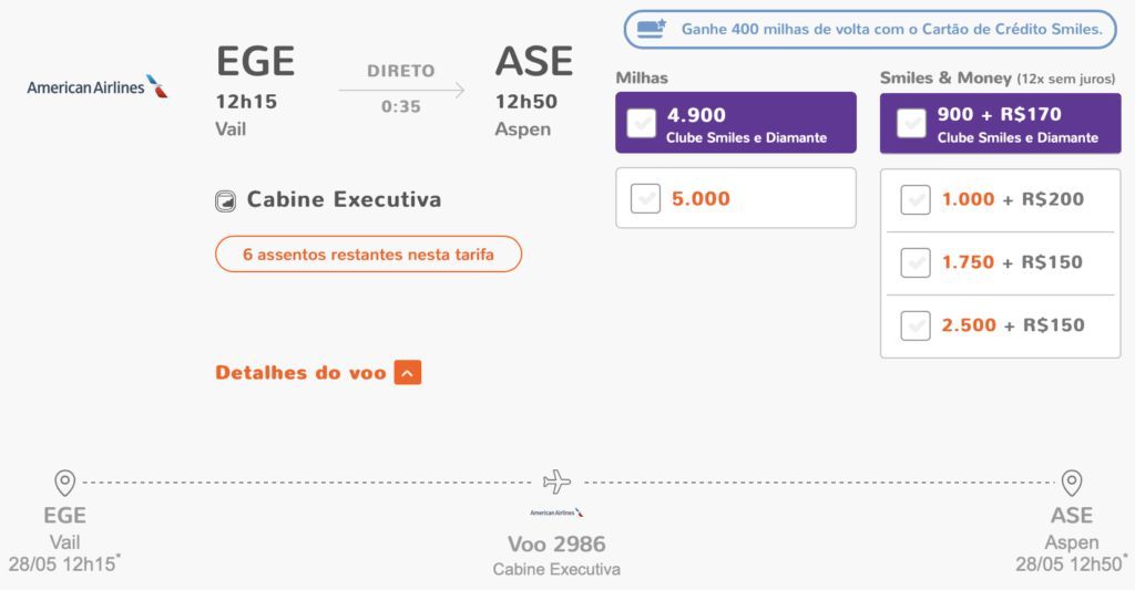 O trecho também pode ser emitido através da Smiles ao custo de 4.900 milhas + R$ 59,95 em taxas para a tarifa em classe executiva.