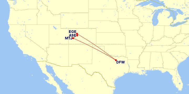 Este voo de Vail para Aspen faz parte de uma viagem mais longa que começa em Dallas: o avião voa de Dallas para Vail, em seguida para Aspen, depois para Montrose e só então retorna novamente para Dallas.