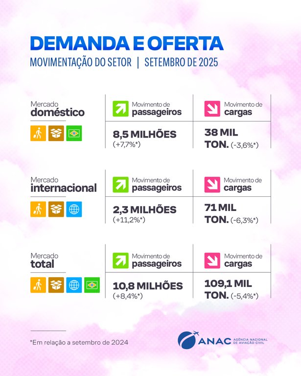 Seguindo a trajetória de alta iniciada em setembro de 2024, o mês de setembro de 2025 registrou 8,5 milhões de passageiros transportados no segmento doméstico, melhor resultado para o mês desde o início da série histórica, em janeiro de 2000. O setor internacional também obteve recorde para o mês, com 2,3 milhões de passageiros movimentados, mantendo a tendência de alta iniciada em abril de 2021. Os dados estão no relatório de demanda e oferta da Anac, agora atualizado até setembro de 2025.