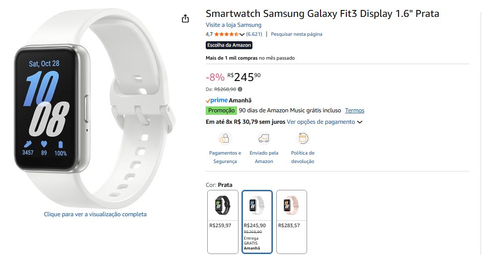 - Galaxy Fit3 | 8% de desconto | total R$ 245,90 – compre aqui