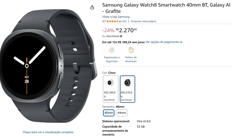 - Samsung Galaxy Watch8 | 24% de desconto| total R$ 2.270 – compre aqui