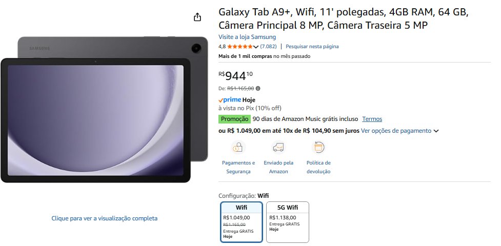 - Samsung Galaxy Tab A9 |10% de desconto – total R$ 944,10 – compre aqui