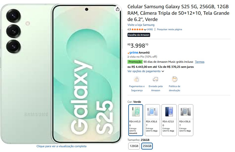 - Samsung Galaxy S25 256GB |10% de desconto – total R$ 3.998,99 – compre aqui
