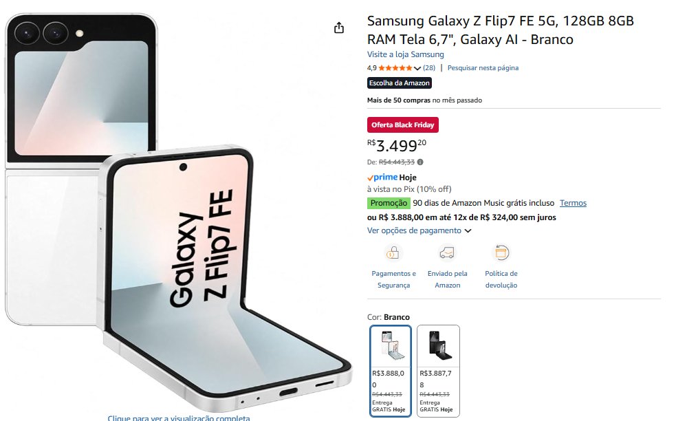 - Samsung Galaxy Z Flip6 |10% de desconto – total R$ 3.499,20 – compre aqui
