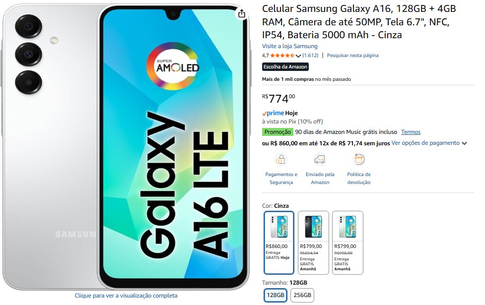 - Samsung Galaxy A16 |10% de desconto| total R$ 774,00 – compre aqui
