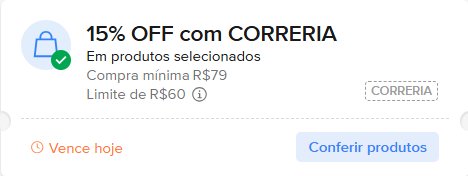 - 15% off, chegando até R$ 60 de desconto, em compras a partir de R$ 79, com o cupom ‘CORRERIA‘ [sem aspas]