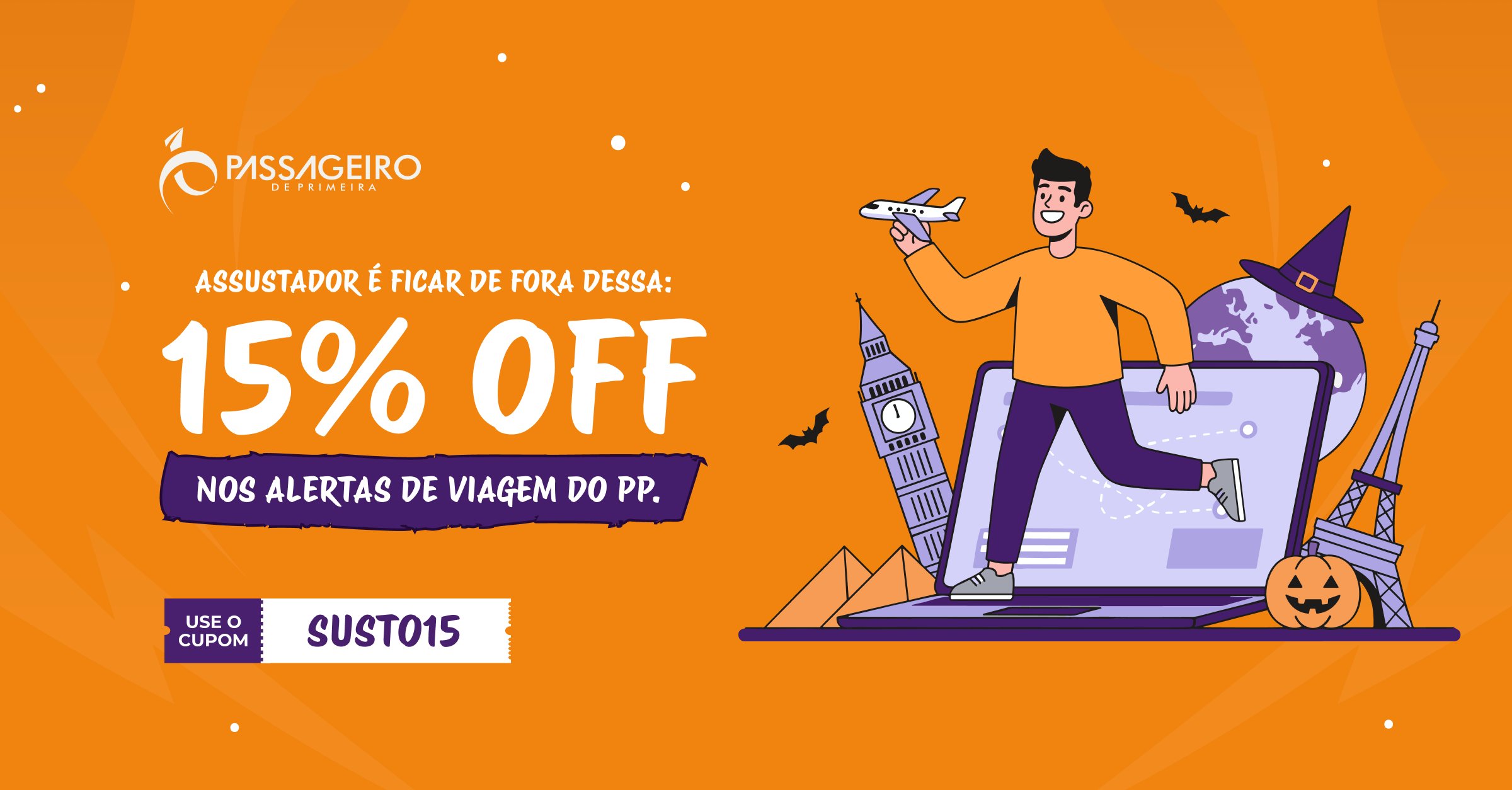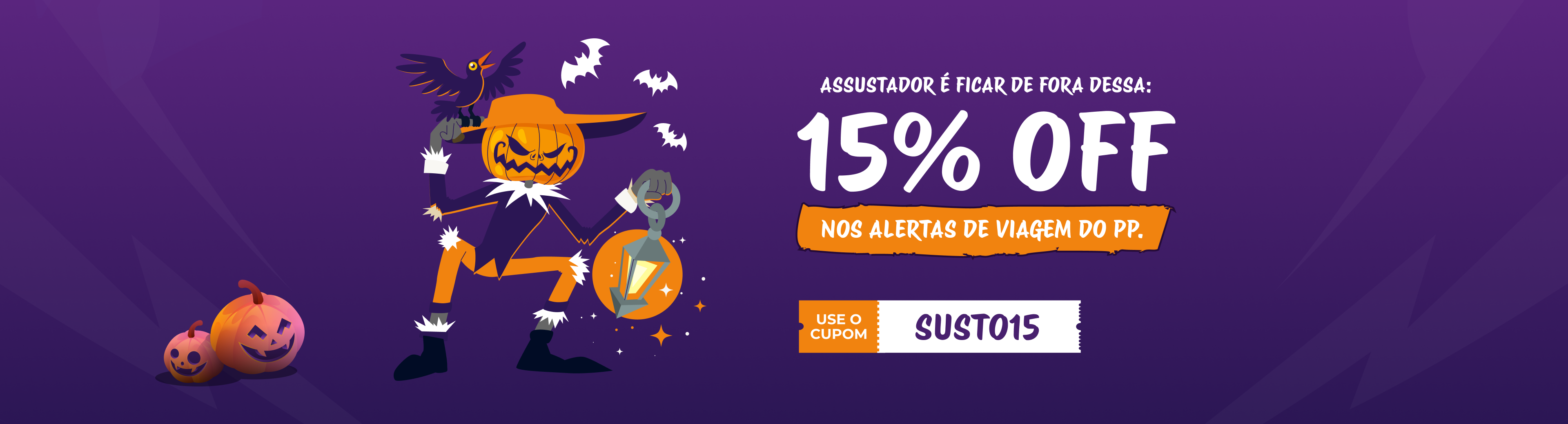 Neste Halloween, afaste o medo de pagar caro em passagens com 15% OFF nos Alertas de Viagem do PP! 🎃 Receba as melhores oportunidades de passagens com milhas direto no seu WhatsApp e aproveite ofertas de arrepiar. Use o cupom ‘SUSTO15’ neste link se tiver coragem de economizar! 👻