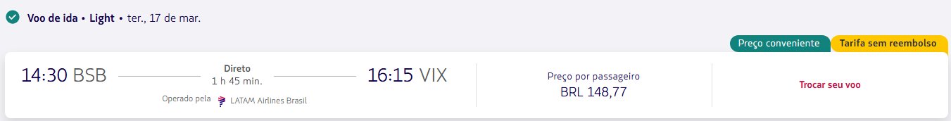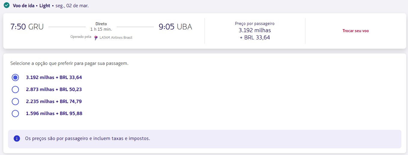 Em nossas buscas, encontramos valores promocionais para passagens nacionais de ida ou volta com a LATAM em milhas ou voos pagantes. Veja a seguir alguns exemplos: