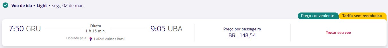 São Paulo (GRU) x Uberaba (UBA) – a partir de R$ 148,54 com taxas inclusas ou 3.192 Milhas + taxas
