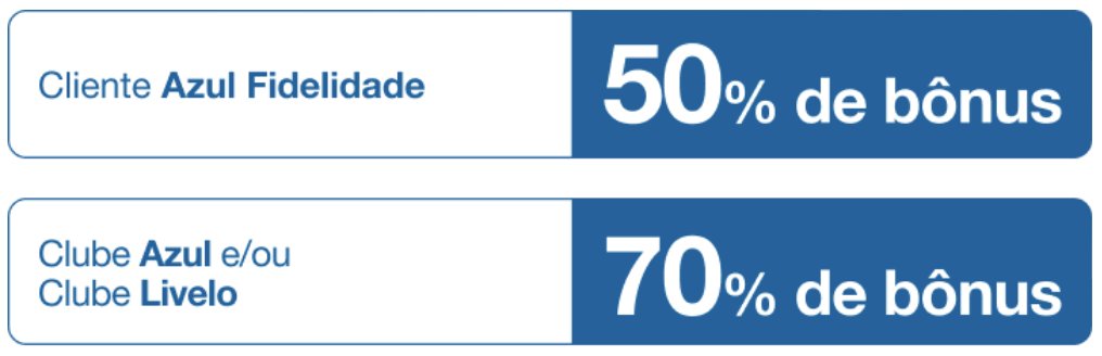 • 70% de bônus: assinantes do Clube Azul e/ou Clube Livelo, com conta ativa;