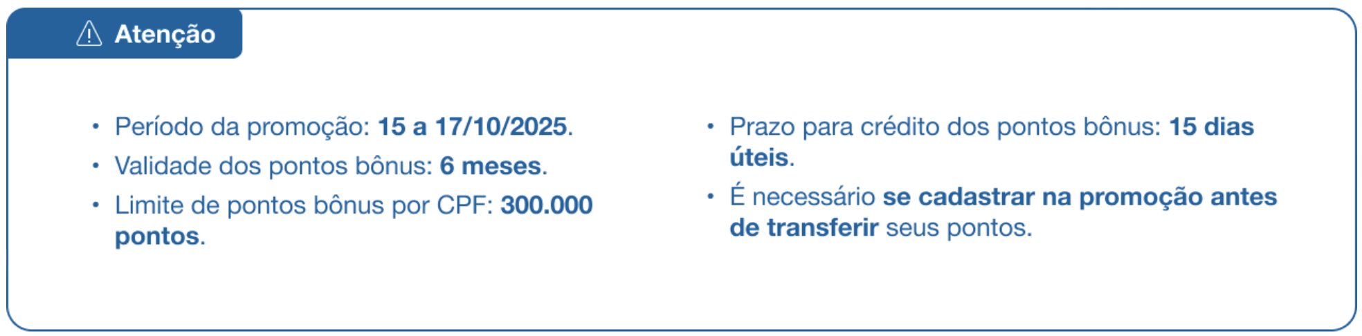 • Clientes Azul que transferirem pontos durante o período promocional receberão 50% de bônus;