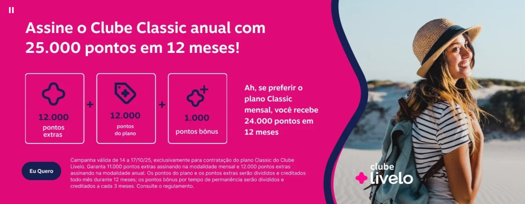 A Livelo está oferecendo até 12.000 pontos bônus em novas assinaturas do Clube Livelo. Ao todo serão creditados até 25.000 pontos no decorrer de 12 meses, gerando um milheiro a partir de R$ 19,40 – o que é muito bom! A campanha é válida apenas até sexta-feira (17) e contempla assinaturas mensais e anuais.