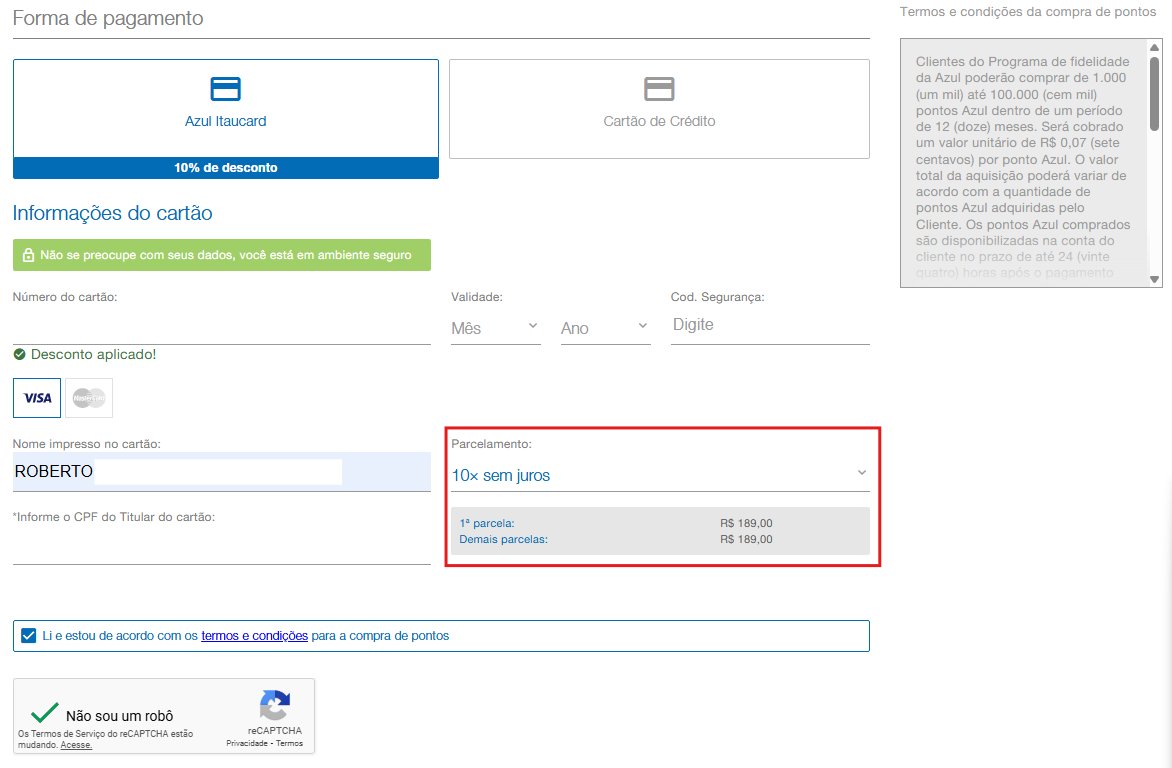- Para ser elegível ao desconto de 10% na compra de pontos, os clientes portadores dos cartões Azul Itaú devem selecioná-lo como forma de pagamento e em seguida inserir os dados do cartão;