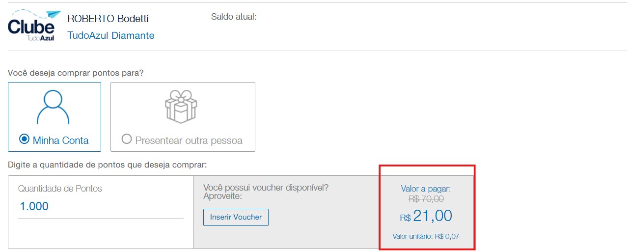 Veja abaixo uma simulação de compra 100.000 pontos para um membro do Clube Azul, onde o CPM sai por R$ 21,00: