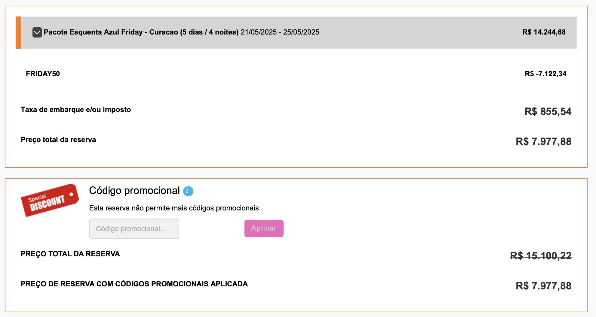 Para receber o desconto, basta inserir o cupom de desconto referente a oferta, na página de pagamento, no campo “Código promocional”. Veja abaixo um exemplo de pacote para Curaçao com 50% de desconto utilizando o cupom ‘FRIDAY50’ [sem aspas]: