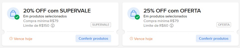 - 20% off, chegando até R$ 150 de desconto, em compras a partir de R$ 79, com o cupom ‘SUPERVALE’ [sem aspas]