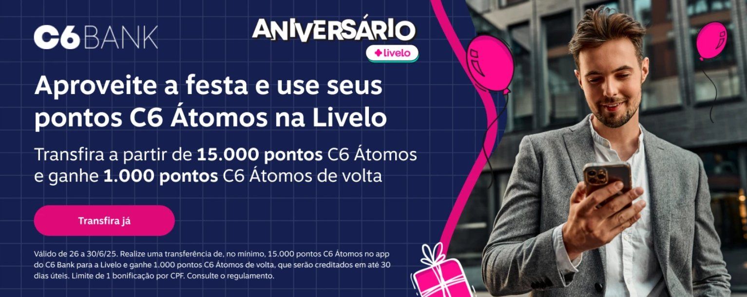 - 1.000 pontos C6 Átomos para quem transferir a partir de 15.000 pontos para a Livelo.