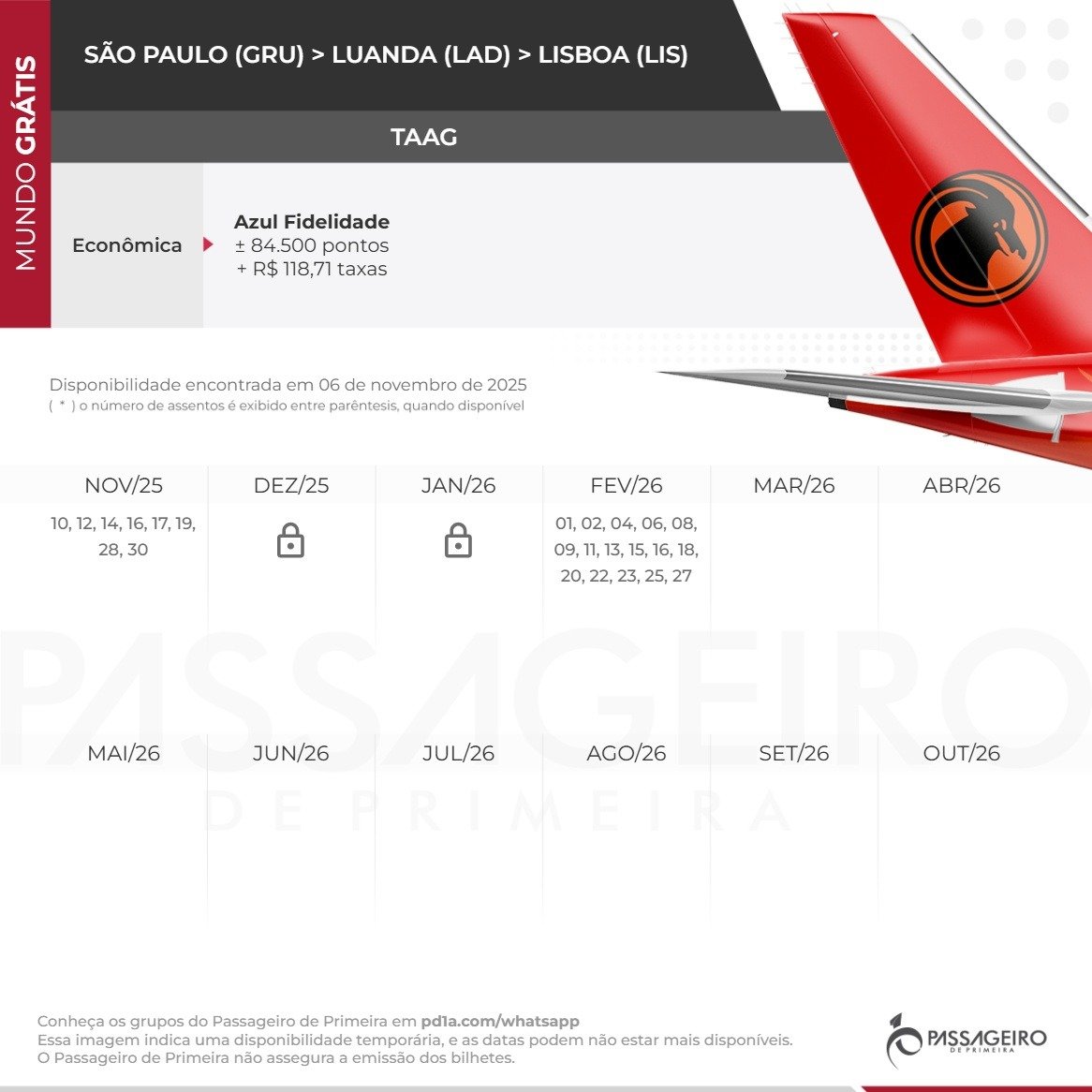 - Rota: São Paulo (GRU) > Luanda (LAD) > Lisboa (LIS)