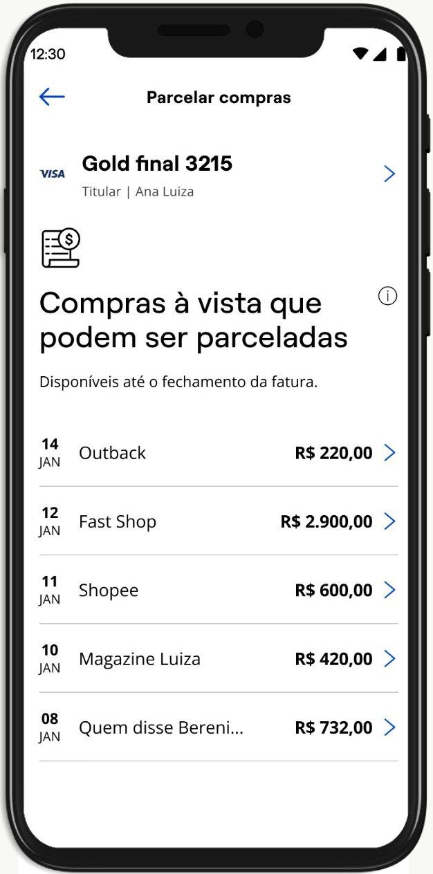 - Ao final da página, em “Produtos e Serviços”, escolha a opção “Parcelar compras”;