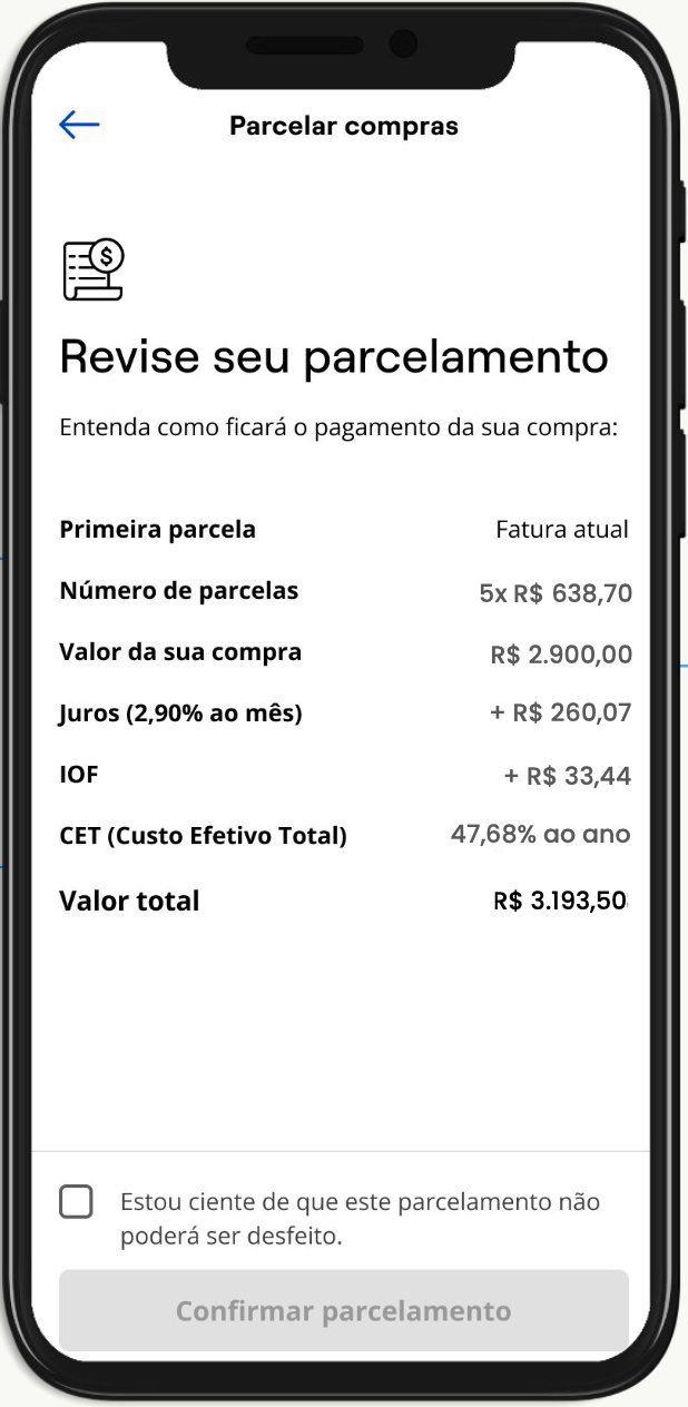 A Porto oferece o parcelamento de compras à vista feitas com o Cartão de Crédito Porto Bank em até 24x, proporcionando flexibilidade financeira e previsibilidade nos pagamentos. Essa solução é ideal para compras realizadas em estabelecimentos que não oferecem parcelamento direto, como as compras feitas no exterior, por exemplo, em viagens internacionais, ou ainda em compras onde os valores costumam ser elevados. Com a opção, é possível transformar um pagamento único em parcelas menores, adaptando os gastos ao seu planejamento financeiro.