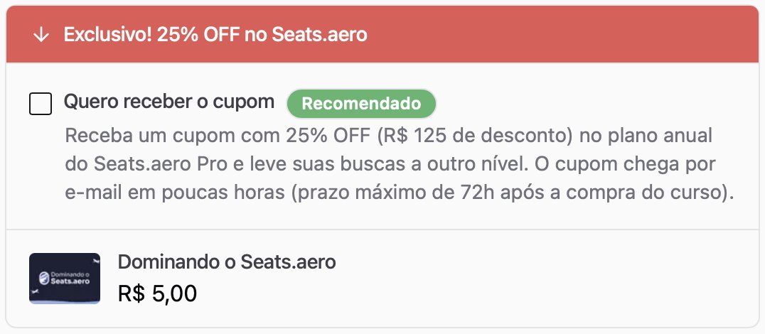 E quem se inscrever agora curso pode garantir 25% OFF no plano anual do Seats.aero Pro por uma taxa simbólica de R$ 5,00. O benefício é limitado a 300 cupons e libera o acesso à versão mais completa da ferramenta, com buscas estendidas, alertas personalizados e recursos avançados para quem quer explorar o Seats.aero no máximo.