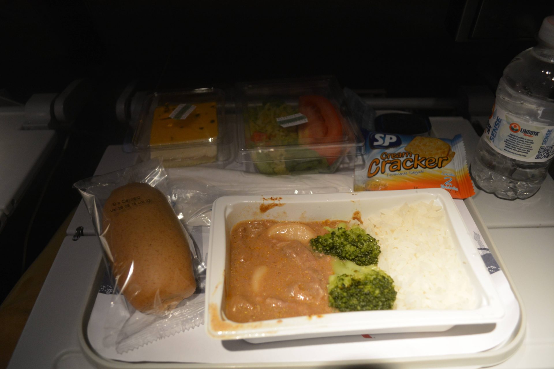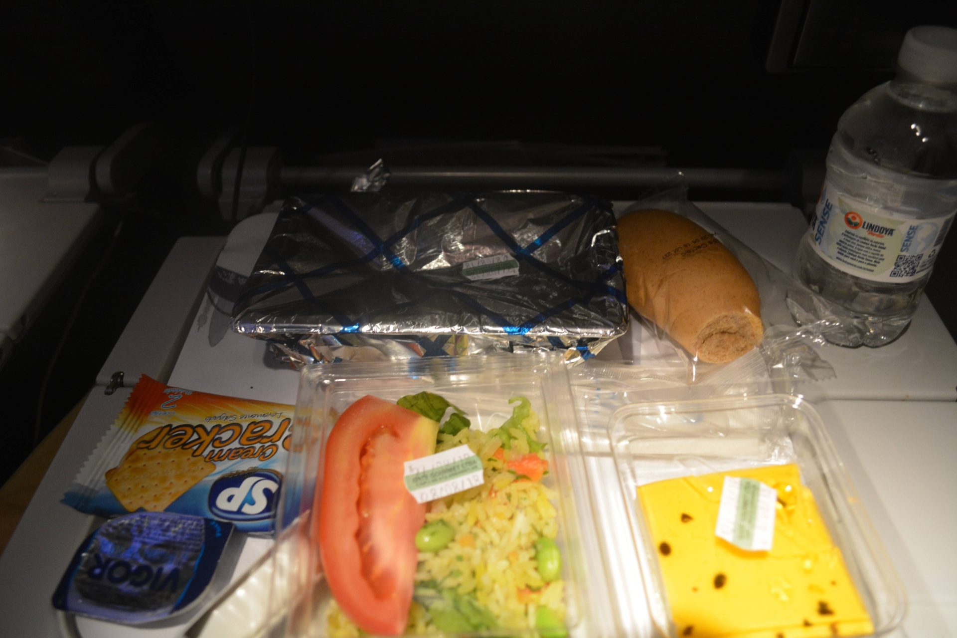Bom, como vocês devem saber o termo “comida de avião” não é usado exatamente para descrever um prato muito delicioso digno de uma estrela Michelin, e esse foi bem o caso nesse voo. Para o jantar eu escolhi um strogonoff de carne com arroz e brócolis, que vinha acompanhado de um pão integral, uma salada de arroz e biscoito cream cracker (é biscoito ou bolacha?).