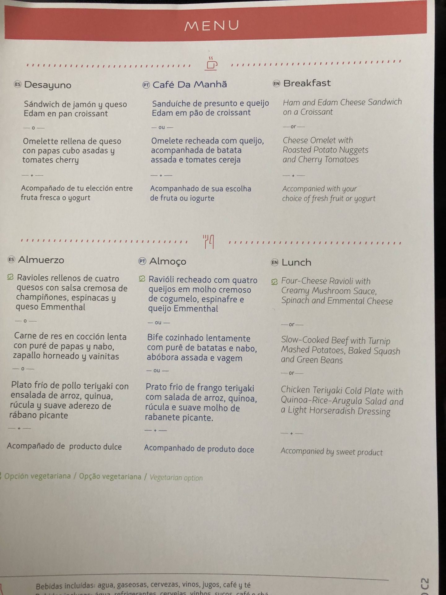 Logo após a decolagem os comissários passaram um “menu” com as opções tanto para o café da manhã quanto para o almoço.