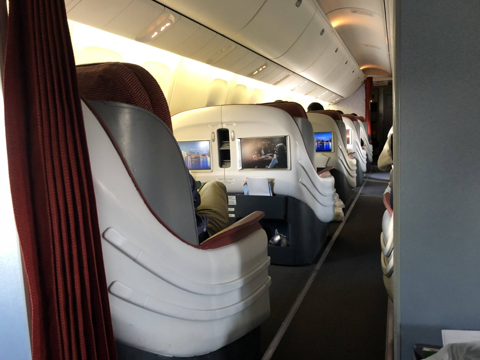 Dessa vez eu peguei o assento da primeira fileira da econômica, bem após a cortininha que divide com a executiva. Essa era a visão do meu assento (dá para “admirar” a executiva, rs), após a decolagem a cortina é fechada.